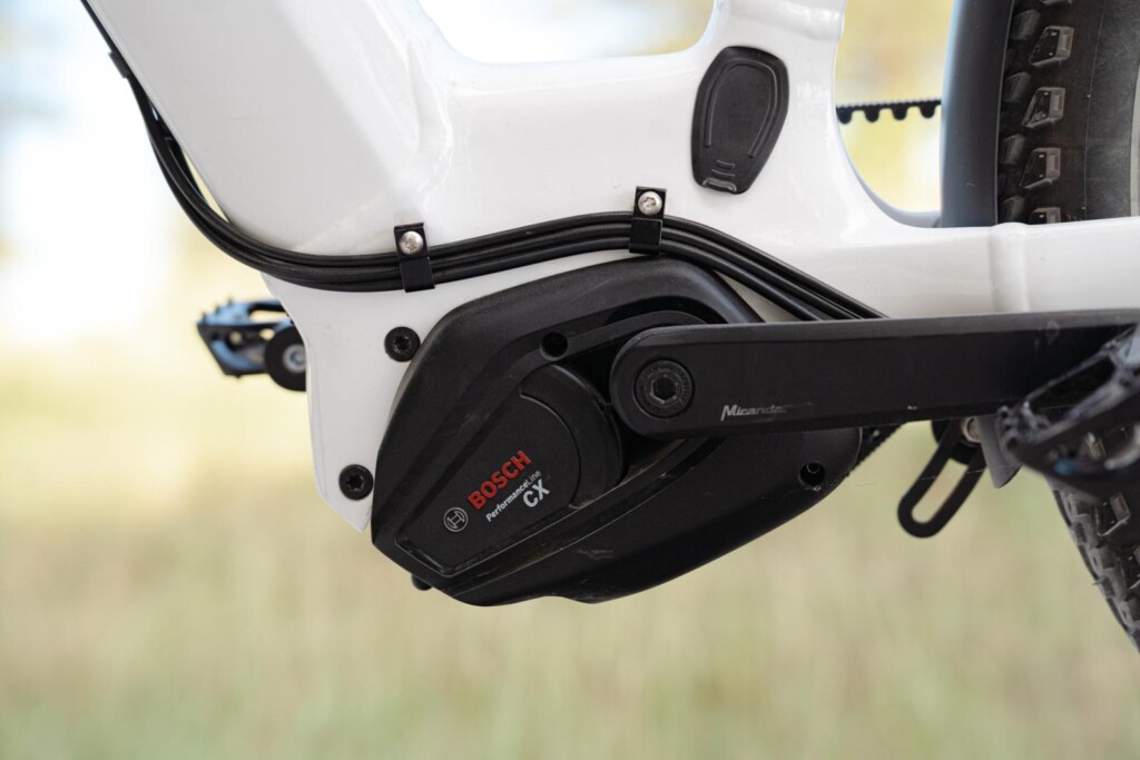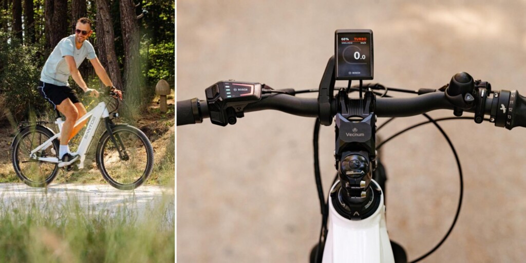 De combinatie van geometrie, vering en grip maakt rijden op de Travelmaster E+ comfortabel en stabiel. Ook met 30 kilo aan tassen blijft de fiets rustig, voorspel- baar en strak sturen. De verende zadelpen is misschien niet het mooiste onderdeel van de fiets, maar doet zijn werk goed: dempen. De Bosch Performance Line CX-motor met 85 Nm levert zijn kracht subtiel, maar resoluut. Zelfs met volle bepakking kom je zonder moeite op gang, ook tegen een helling op. Santos’ eigen PowerMount-systeem zorgt ervoor dat je verschillende accuformaten in het frame kunt plaatsen. Ook is het mogelijk om een extra 250 Wh-accu op de onderbuis te monteren. Afhankelijk van de set-up is een actieradius tot 180 kilometer mogelijk. De 57 millimeter brede banden geven een prettig gevoel van grip, ook bij slechte weersomstandigheden. In combinatie met de verende stuurpen en zadelpen zorgt dit langdurig voor een hoop rijcomfort.