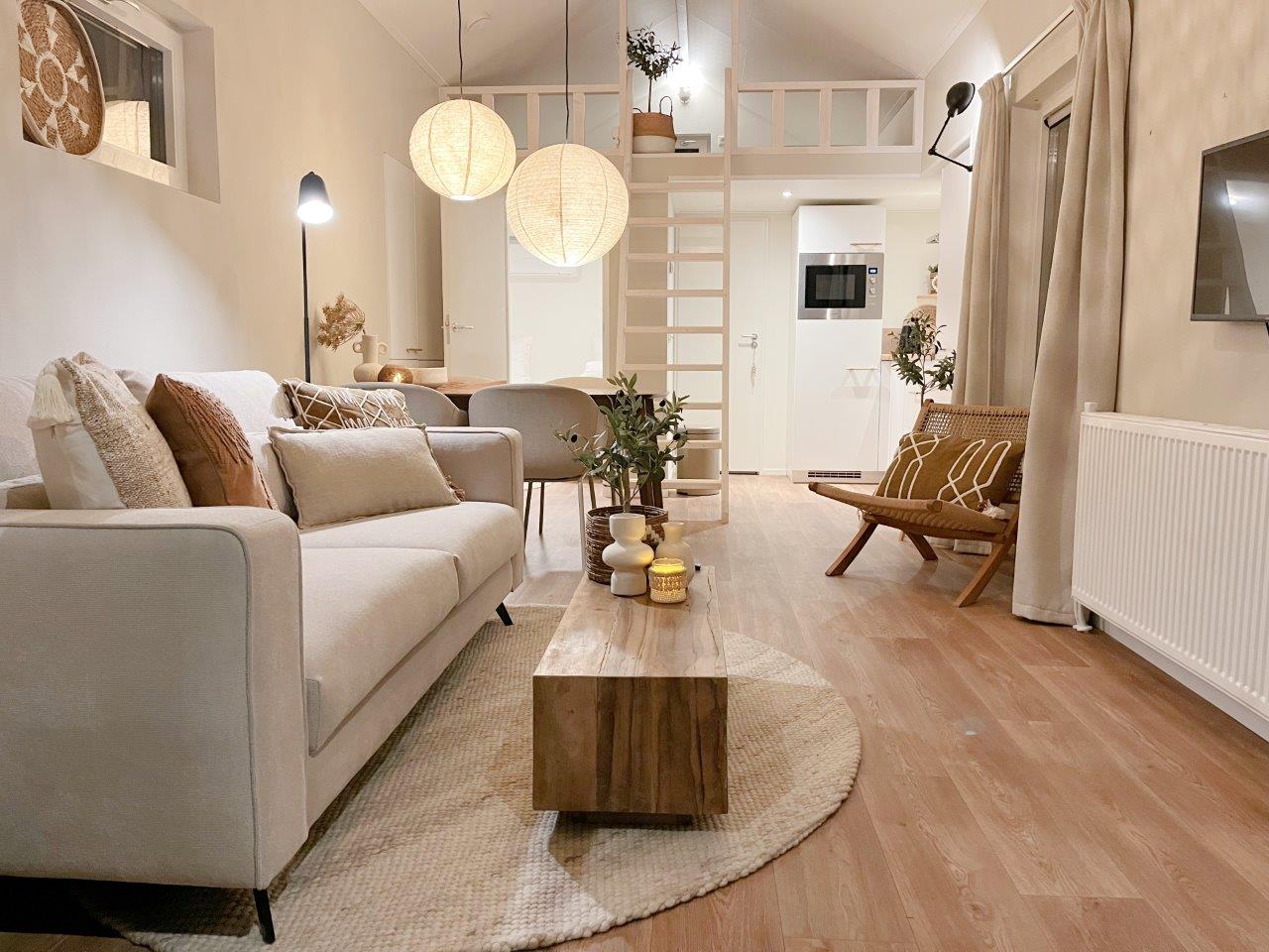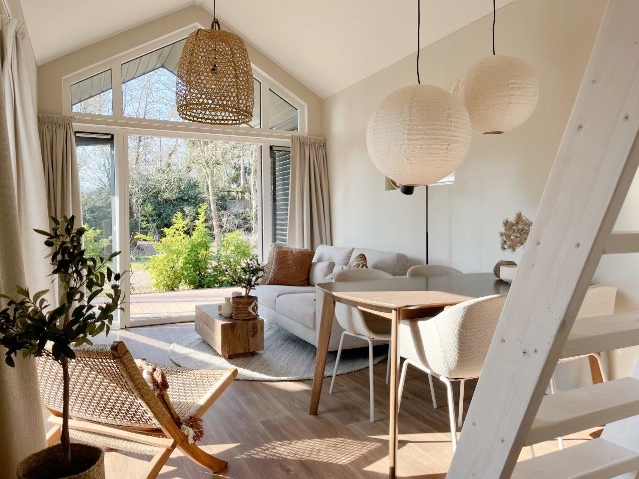 Nieuw is het BosChalet. Dit sfeervolle huisje is warm en landelijk aangekleed met veel hout en natuurlijke materialen, waardoor het de sfeer van een echt gezellig boshuisje ademt. Vanuit de openslaande deuren kijk je lekker weg. Geniet van een kop koffie op de overkapte veranda, lekker ingepakt in een warm vest of een dekentje. Het huisje is klein maar voelt heel ruim, in de woonkamer kijk je tot in de nok van het dak. De woonkamer is gezellig ingericht met een fijne bank, een 4 p. eettafel en flatscreen TV – ook een fijn plekje dus om een paar regenachtige uurtjes uit te zitten met een goed boek. Of neem lekker de tijd om uitgebreid te koken. De moderne keuken is compleet uitgerust en voorzien van een oven/magnetron, vaatwasser en inductiekookplaat en een Nespresso apparaat.