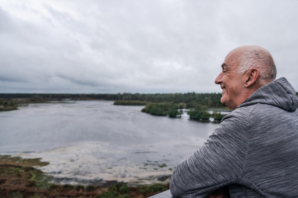 Het eerste stukje is nog onverhard, maar we zitten al snel op het fietspad, waar na twee kilometer de Flaestoren opduikt. Met 22 meter hoog een opvallende verschijning in deze bosrijke omgeving. Je kunt de toren beklimmen voor een euro. Wat een uitzicht! Kilometers ver kijk je over meer, heide en bossen. Als we onze weg vervolgen, valt het wel op dat het soms erg krap is op de (goed onderhouden) fietspaden, uitkijken dus. Spotten we daar nou een ree tussen de bomen?