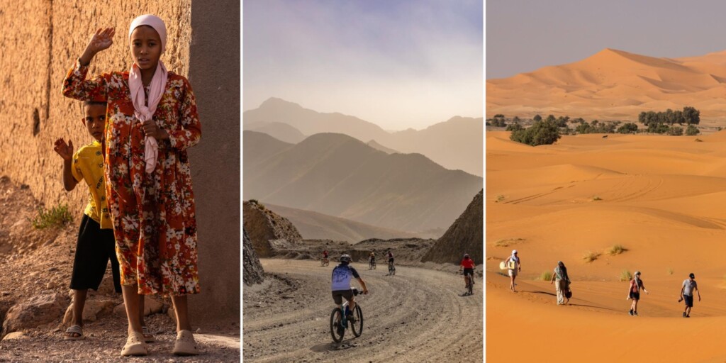 Op de eerste ochtend kijken de knaapjes uit de buurt mee door de camera van fotograaf David, schouder aan schouder staan ze op een muurtje met uitzicht op het dal. De volgende morgen in een volgend dorp verdringen andere jochies zich rondom onze groep, de fotograaf koopt drie voetballen voor ze, twee euro per stuk – de jochies verdwijnen meteen naar het lokale voetbalveld om te spelen. We stappen op onze goede mountainbikes met veel versnellingen, broodnodig materiaal voor deze fietstocht van meer dan 300 kilometer door Marokkaanse gebergten en over ruwe vlaktes. ‘Om jullie zoveel mogelijk verschillende landschappen te laten zien,’ zegt reisleidster Sylvia. ‘Leggen we in totaal zo’n 1300 kilometer af, grote delen rijden we met de bus.’ Begin- en eindpunt is het kleurrijke Marrakech, waarover ik al veel heb gehoord en dat me desondanks toch weet te verrassen.