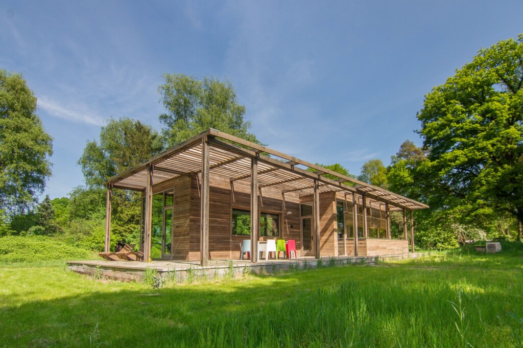 Paviljoen Esch is een plaatje. Hier zie je hoe mooi – en vanzelfsprekend eigenlijk – duurzaam bouwen eigenlijk is. De rechtervleugel zit als een slimme puzzel in elkaar, de linkervleugel is een zee van ruimte met een living van vier meter hoog. Buiten ligt een uitgestrekte tuin, helemaal voor jou alleen. Een paradijsje met al die ruimte om het huis.